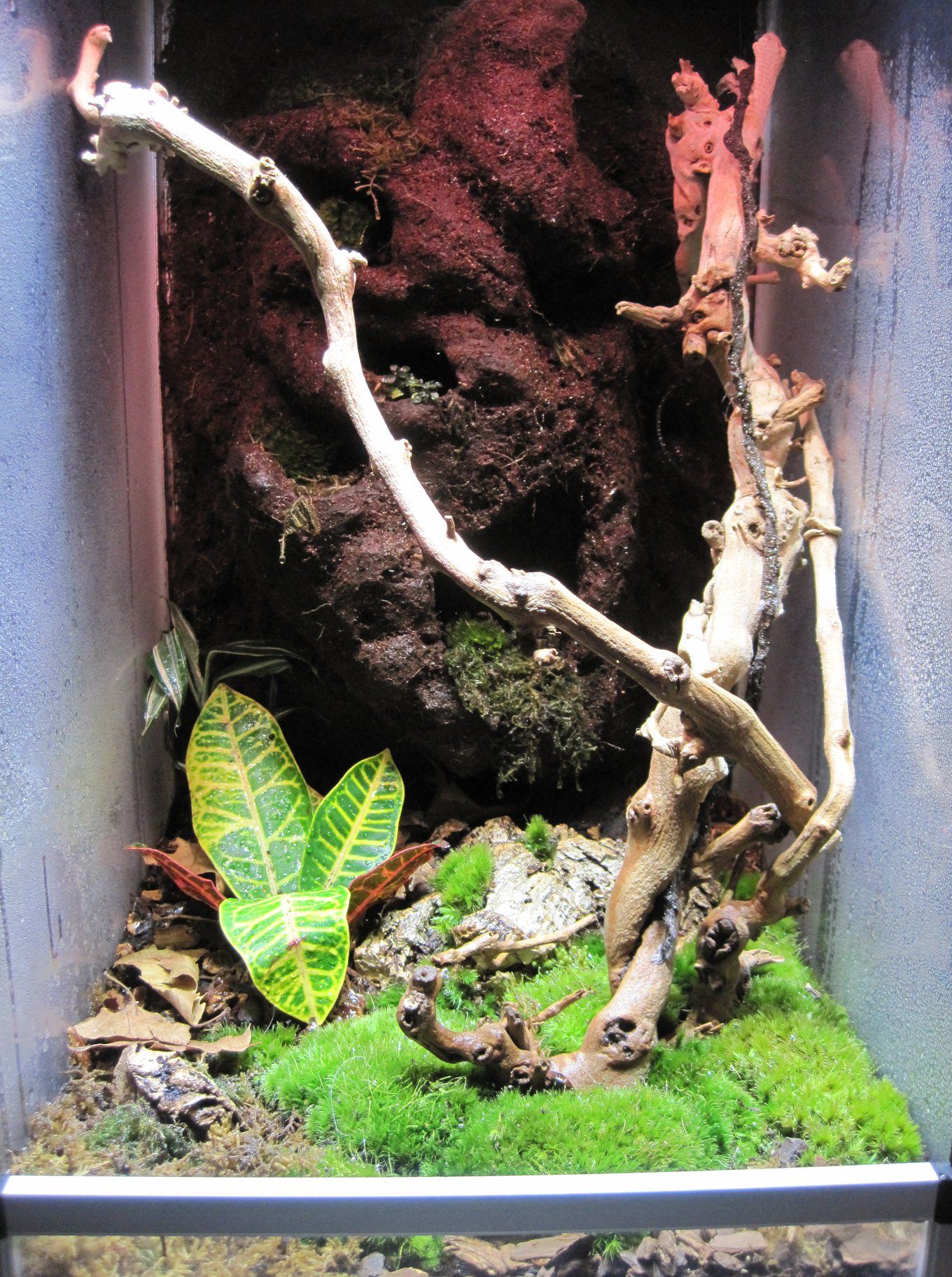 I ended up getting a large acrylic terrarium from Reptile Edge . Cuthbert went from having a little tank, to a happy 100 litres (26.49 gallons). The final dimensions I ended up working with were 38.1 x 43.18 x 60.96 cm (15 x 17 x 24 inches).
